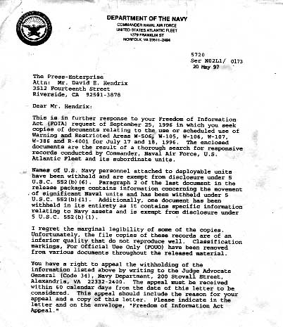 Dated May 20, 1997, this letter was a response from the U.S. Navy to a freedom of information act request by David Hendrix of the Press Enterprise Newspaper of Riverside, CA.
